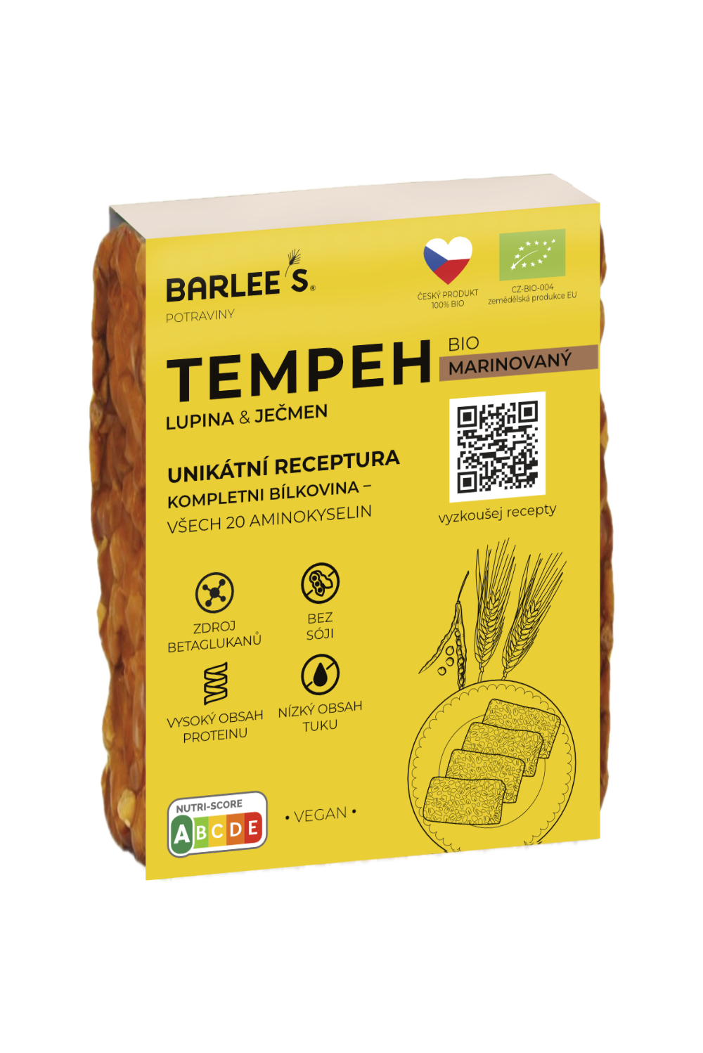Eine fermentierte Delikatesse aus tschechischer Lupine und Gerste – MARINIERTES TEMPEH ist ein hervorragendes Pflanzenprodukt, das vollwertige Proteine ​​liefert. Dieses Produkt ist das Ergebnis der Fermentation von Gerste und Erbsen, zwei reichhaltigen pflanzlichen Proteinquellen, die sich gegenseitig ergänzen und alle essentiellen und nicht-essentiellen Aminosäuren bieten, die für eine optimale Gesundheit erforderlich sind. Unser Tempeh enthält alle 20 Aminosäuren , die die Grundbausteine ​​des menschlichen Körpers bilden.