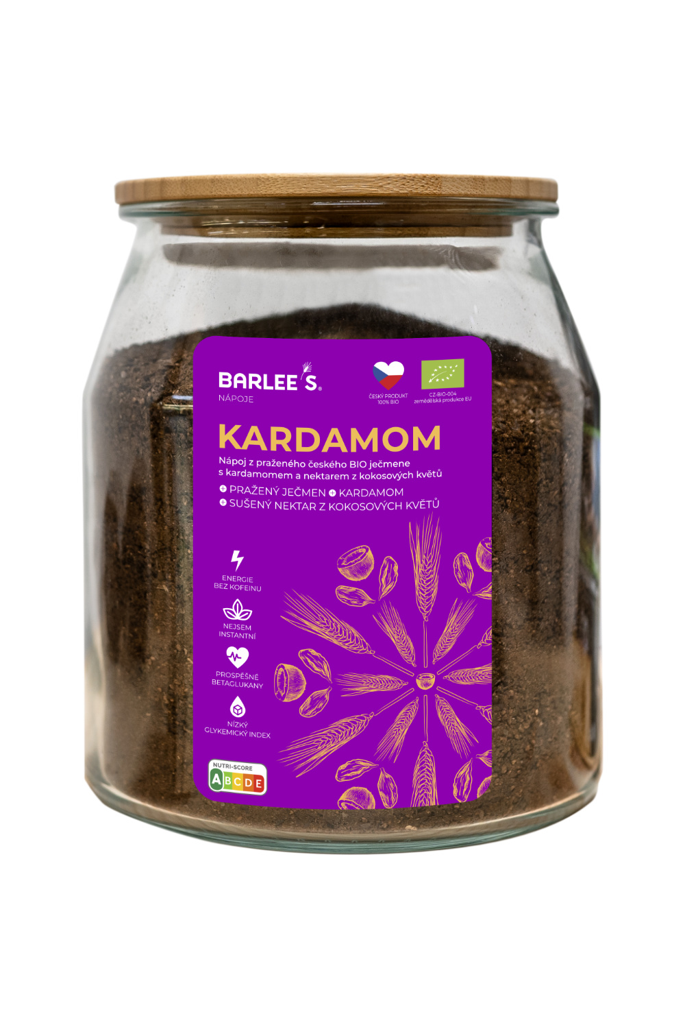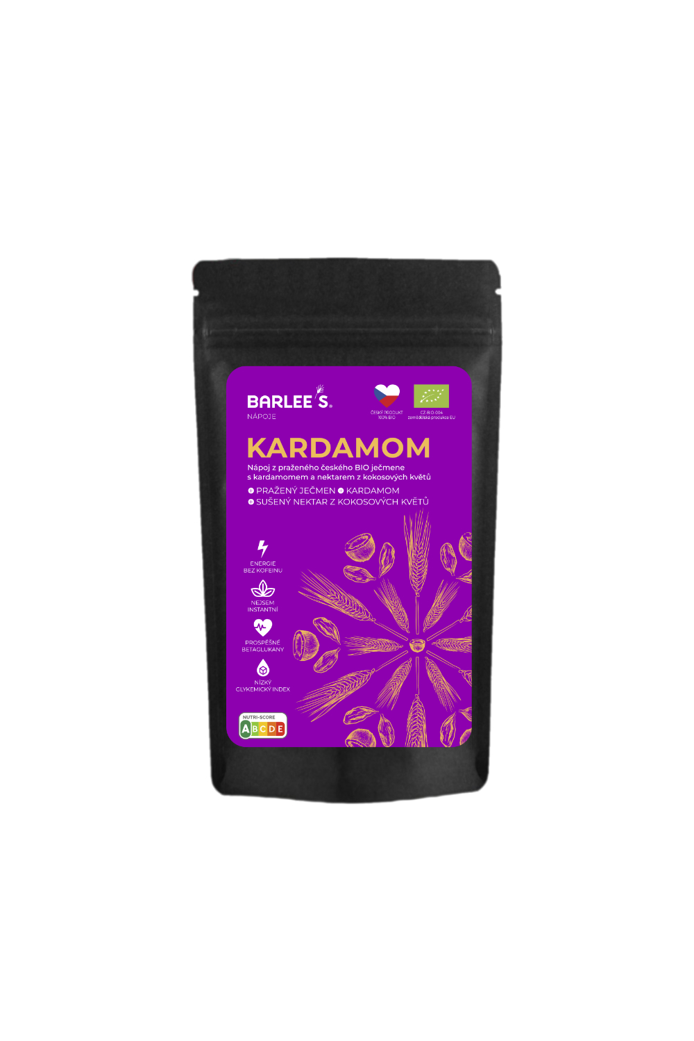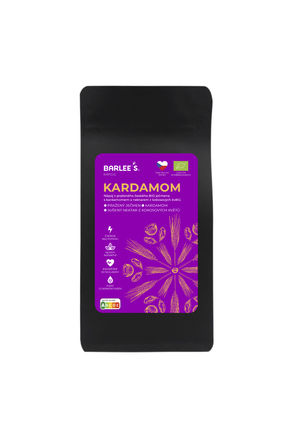 Složení: pražený BIO ječmen*, BIO kardamom*, BIO kokosový cukr*. Výrobek obsahuje lepek. *Produkt ekologického zemědělství.